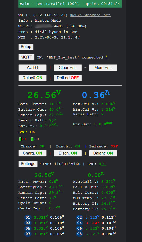- Режим Master — выполняет роль Master BMS для сборки. Опрашивает все БМС на порту. Позволяет управлять (менять настройки) и мониторить каждую BMS. Консолидирует данные (ток, ёмкость, мощность, SOC) и отправляет их на WEB страницу или в Home Assistant.